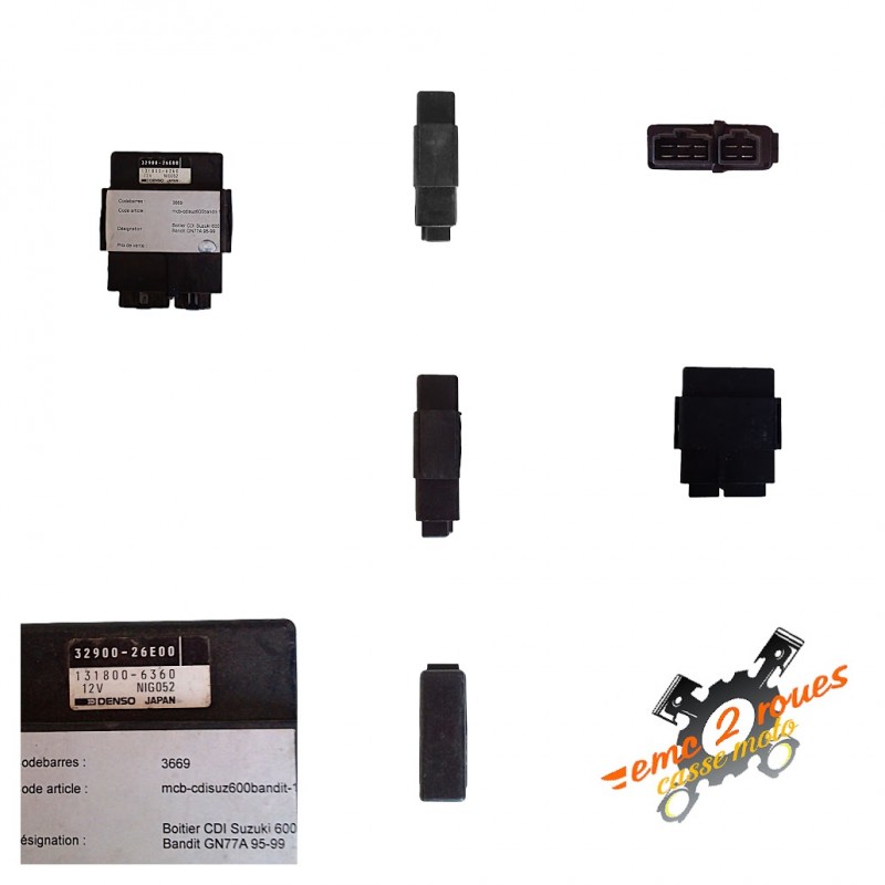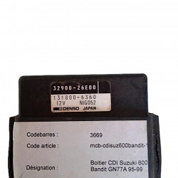 Boîtier CDI d'origine pour Suzuki Bandit GSF 600, modèles de 1995 à 1999 (type GN77A). Cette pièce d'occasion est en parfait état de fonctionnement, prête à être installée pour restaurer l'allumage de votre moto. Sa référence constructeur est 32900-26E00, garantissant une compatibilité parfaite. Nous offrons une garantie d'un mois si la pièce est montée par un professionnel, avec présentation d'une facture. Une solution fiable et économique pour la réparation de votre Bandit.